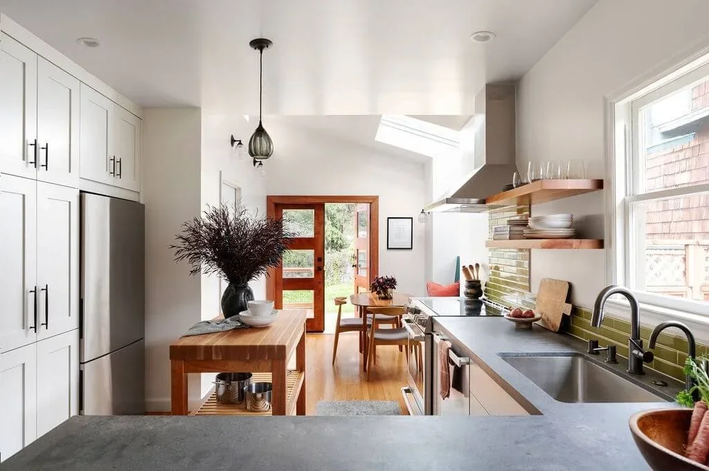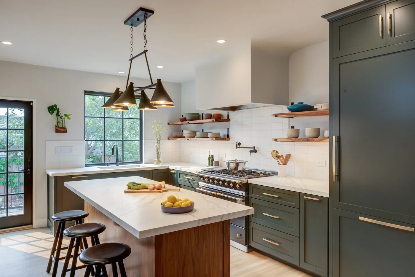 In one project, a contemporary kitchen nodded to its mid-century roots with avocado-green backsplash tiles, warm wood accents, and period-inspired furniture — achieving a fresh, timeless look with just the right hint of retro.