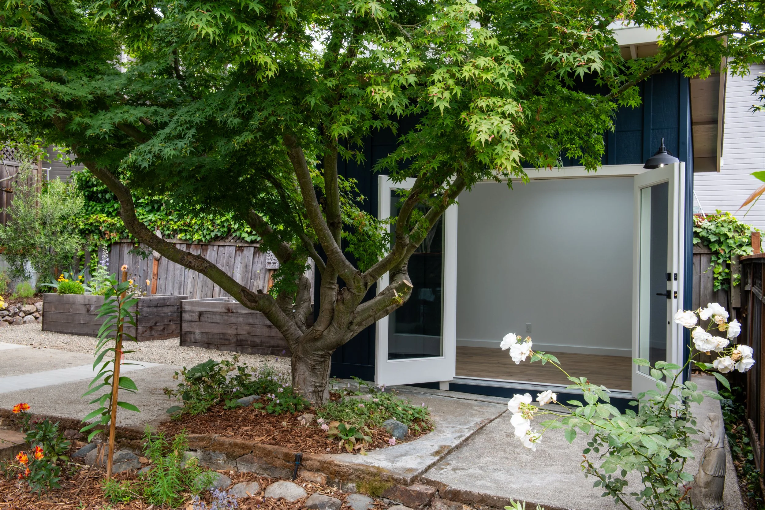 Light and airflow were essential. We added operable windows, a skylight, and French doors to create a space that is bright and breathable. The French doors were thoughtfully placed in alignment with an existing concrete step, which helped integrate the new structure with the landscape. The client also plans to add flower boxes to the entry to further soften the space and connect it with her garden.